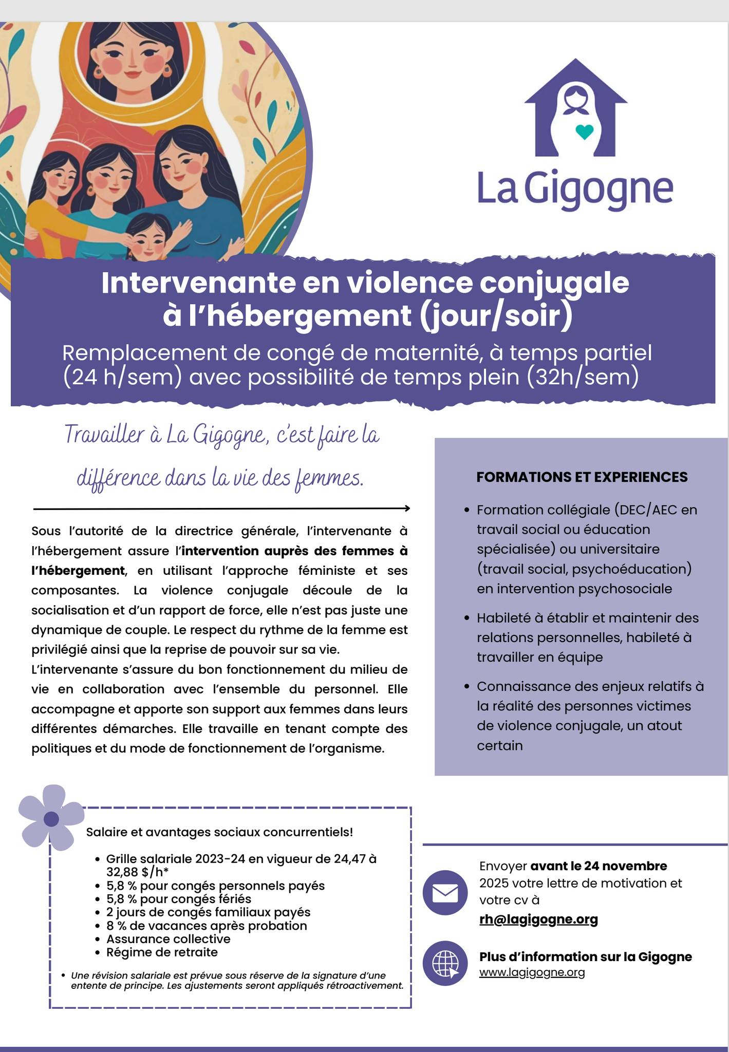 Intervenante en violence conjugale à l’hébergement (jour/soir) – remplacement de congé de maternité